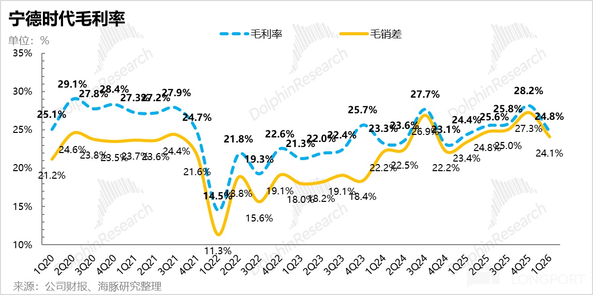 1Q26公司毛利率为24.8%,单Wh毛利从去年四季度的0.18元/Wh下滑至约0.16元/Wh。虽然相比去年四季度产能满载时的高点(毛利率28.2%)有所回落,但整体表现与市场预期持平,展现了极其稳健的盈利韧性。