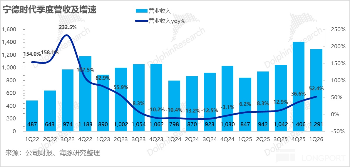 2026年一季度单季收入1291亿元,同比大幅增长52%,再次验证锂电上行周期启动,并大幅超出市场预期1142亿。超预期的核心在于出货量继续高增,以及在上游原材料涨价背景下,公司凭借强大的议价能力顺利将成本传导至下游,带动了销售单价提升。