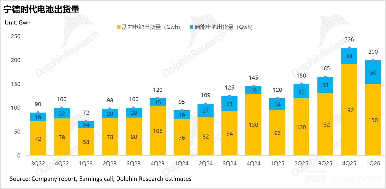 综合考量公司产能周期的重新扩张、海外(尤其是欧洲)产能的加速爬坡以及全球储能市场的爆发,海豚君进一步上调2026年宁德时代电池总出货量预期至 950GWh(同比增长44%)。具体出货结构与核心驱动如下:
