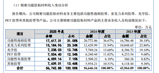 精密功能胶粘材料细分品类丰富,主要包括功能性泡棉胶带、亚克力系列胶带、光学胶、PET胶带、功能性布基胶带及其他胶带产品,具体情况如下: