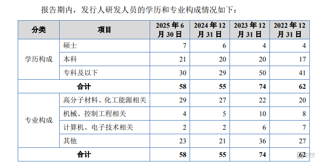 而与表现优异的毛利率形成反差的是,富印新材研发投入水平相对有限。报告期内,富印新材的研发费用率分别为5.95%、3.99%、4.8%,存在波动,2023年和2024年,同行可比公司平均值分别为5.9%、5.49%,2024年富印新材的研发费用率远低于同行均值。在研发人员结构上,截至2022年末、2023年末、2024年末及2025年6月末,富印新材研发人员数量依次为62人、74人、55人、58人,其中未达到本科学历的研发人员分别为41人、50人、29人、30人,对应占比分别为66.13%、67.57%、52.73%、51.72%,各期研发人员中学历未及本科的群体占比均维持在半数以上,。综合来看,富印新材在研发费用投入不足、研发人员整体学历偏低的情况下,依旧长期保持远超同行的高毛利水平,这一经营现象背后的合理性与可持续性,仍需富印新材作出进一步解释与说明。