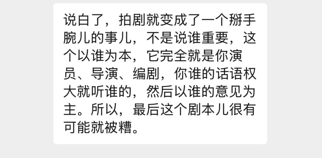 而进入拍摄环节后,演员又会提出修改意见,编剧依然要全盘接纳,并平衡各方诉求。如果不配合,不仅后续40%的稿费拿不到,前面拿的也得“吐出来”,甚至有可能被圈内封杀。拍摄期间,场景变更、演员特殊情况需要临时改稿,更有演员为给自己增加高光戏份,自带跟组编剧,倒逼原编剧妥协。