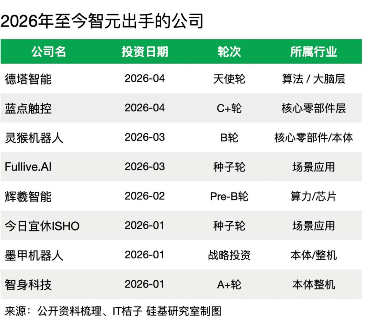 据我们的不完全统计,开年至今,智元已对外已投了8家企业,覆盖基模、零部件等领域。