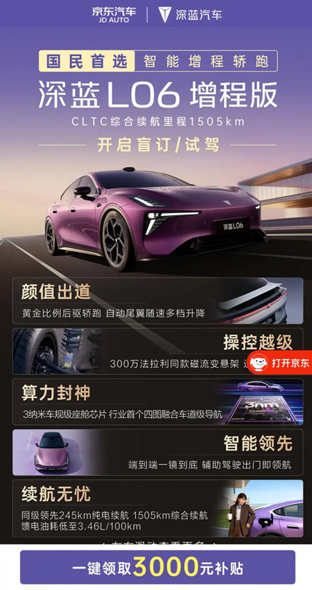 今年,京东跟深蓝汽车合作的“国民好车”则从1.0迈入2.0阶段,双方合作推出深蓝L06增程版,定位为“年轻人第一辆智能轿跑”,对标10-15万元的主流新能源汽车市场,主打无续航焦虑、智能驾驶与操控体验,更契合年轻人追求个性、展示自我的需求。