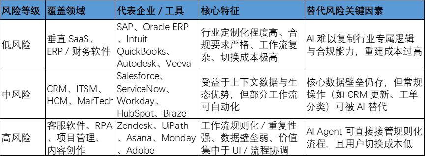 我们根据工作流的复杂度、合规要求、数据依赖性和重复性,将当前SaaS行业面临的AI冲击风险分为三类总结如下表: