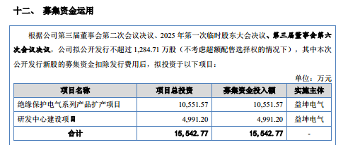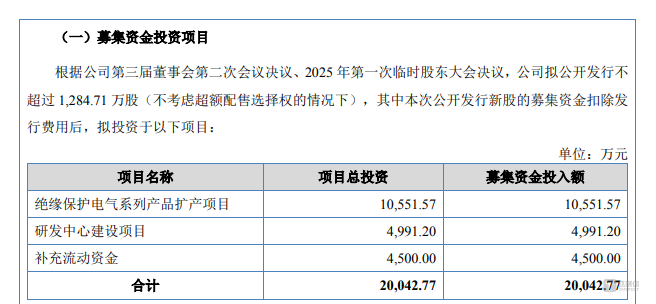 笔者注意到,益坤电气于2025年6月向北交所提交IPO申报稿并获受理,首轮申报中公司拟募集资金20042.77万元,分别用于绝缘保护电气系列产品扩产项目、研发中心建设项目及补充流动资金,具体情况如下: