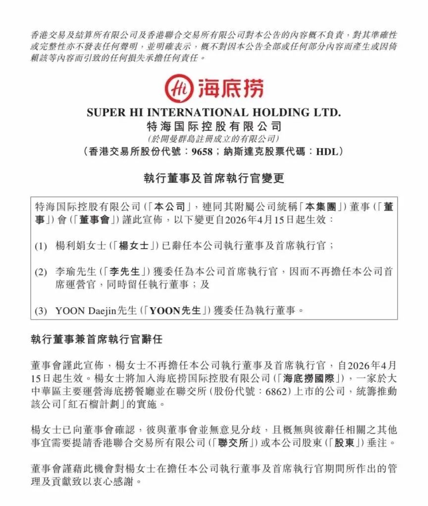 4月15日晚,特海国际发布公告,46岁的杨利娟已辞任公司执行董事兼CEO,并将重返海底捞,统筹推动其多品牌孵化战略“红石榴计划”。