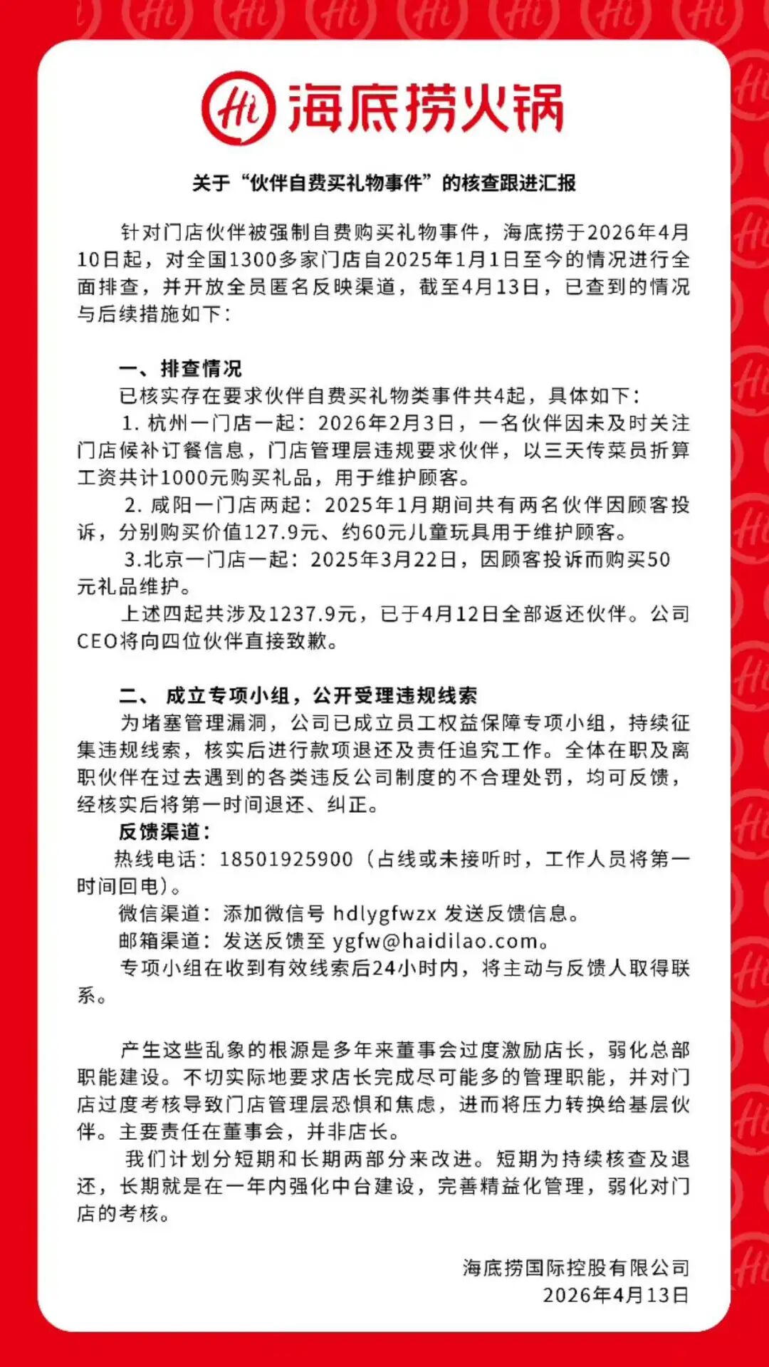另一方面,最近海底捞也正身陷舆论风波。一周前,海底捞被曝光存在门店强制员工自掏腰包购买礼品讨好顾客的情况,随后公司启动全国排查,共发现4起类似案件,涉及金额千余元。