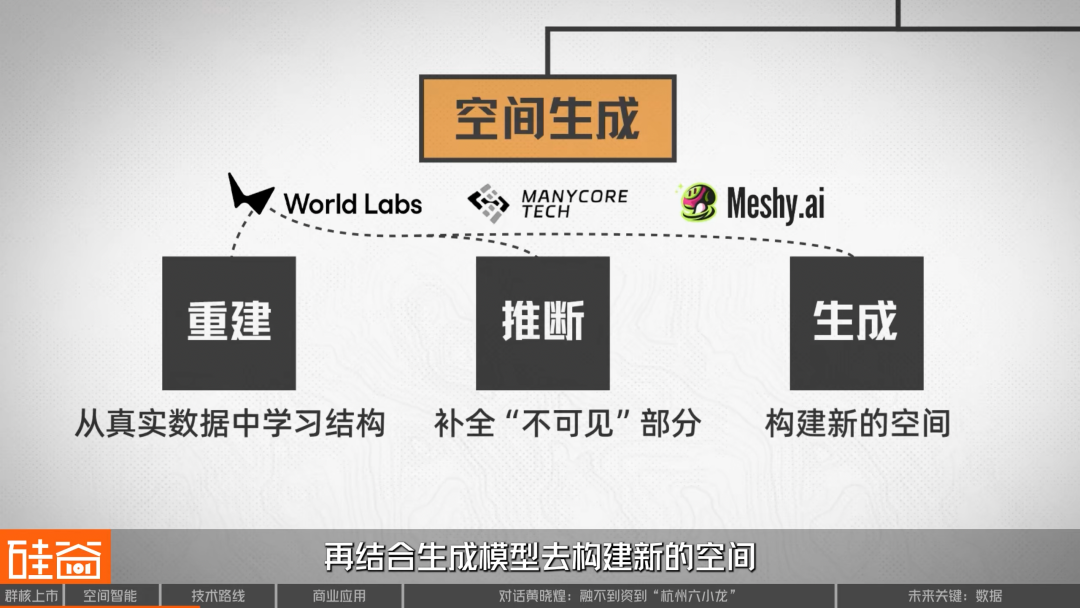 以World Labs为例,虽然外界常把它归类为生成式路线,但它的目标并不只是生成3D内容,而是构建具备空间理解能力的世界模型。在这个过程中,它既借鉴重建式从真实数据中学习结构,也依赖推断能力补全不可见部分,再结合生成模型去构建新的空间。因此模型不仅要具备生成能力,还要同时处理深度估计、视角一致性以及几何约束等问题,从而让生成结果不仅“看起来像”,而且在空间结构上是成立的。