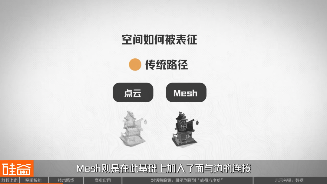传统的路径,是用点云、Mesh这样的方式来描述三维世界。点云是离散的点集,Mesh则在此基础上加入了面与边的连接,两者虽然形式不同,但核心思路是一致的,那就是通过在三维空间里打满坐标,把世界固定和搭建出来。这条路线直观、成熟,Mesh的编辑和修改尤其方便,因此在游戏、建模、数字孪生等领域被广泛使用。但现实世界的细节近乎无限,高精度往往意味着数据量的指数级增长,从采集、存储到实时渲染都面临巨大压力。