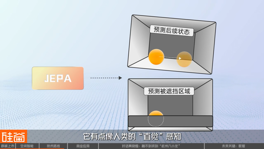 这些研究者们认为,空间本质上是一组复杂的数学关系,AI并不需要还原视觉上的每一个像素,而应将复杂的环境信息压缩进高维的潜空间中。在这个空间里,AI学习的,是环境动态的统计规律——物体之间的距离、方位与因果联系。它有点像人类的“直觉”感知,即便没有精致的三维模型,依然能做出准确判断,从而实现更低延迟、更强泛化性的实时交互。这一路线代表包括Yann LeCun的JEPA架构、以及DeepMind的Dreamer系列等等。