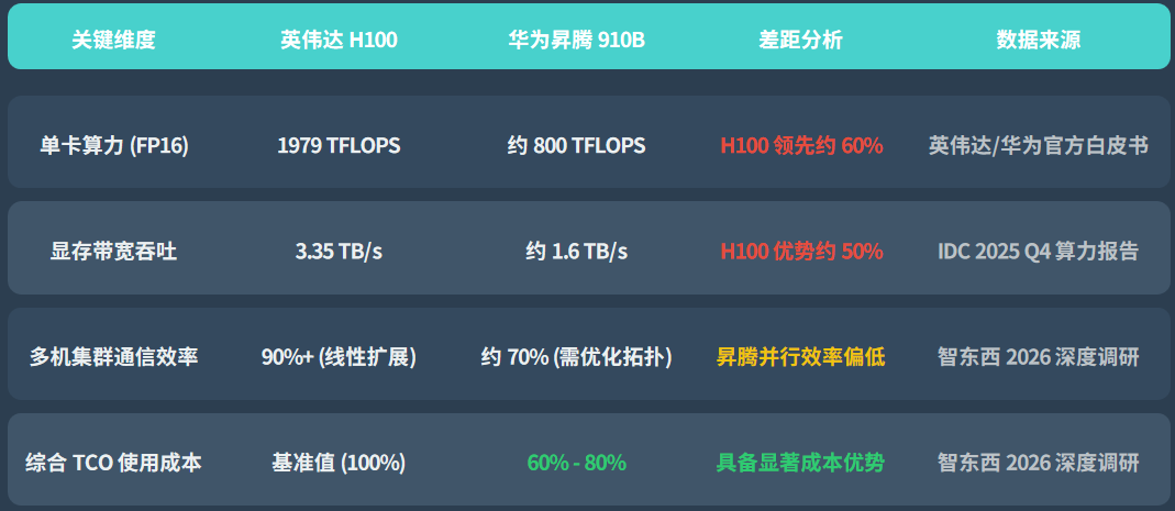华为官方数据显示,昇腾910B在典型推理场景中可达H100的70-80%性能。据华为昇腾社区2026年1月公开案例,某互联网公司从英伟达迁移到昇腾,耗时5个月,综合算力成本降低35%。