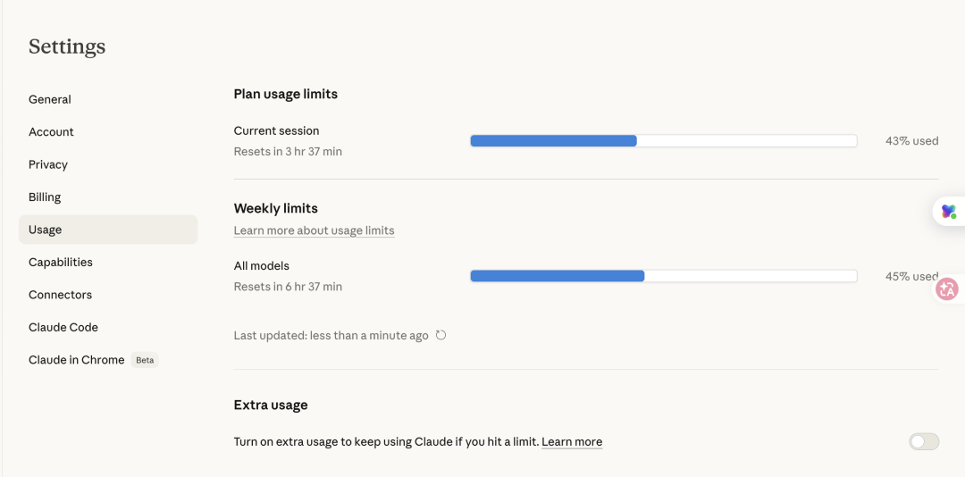 Claude限用让苏玉异常焦虑。在一个周二,苏玉发来一张Claude后台截图,上面显示她本周的限额已经使用了45%。“这周才过去不到两天!我已经用得很节省了,一天只讨论一个论文选题,它就到限额了!”苏玉情绪有点崩溃,谁说AI不能替代人类?这个AI已经快比她的导师还难搞了。