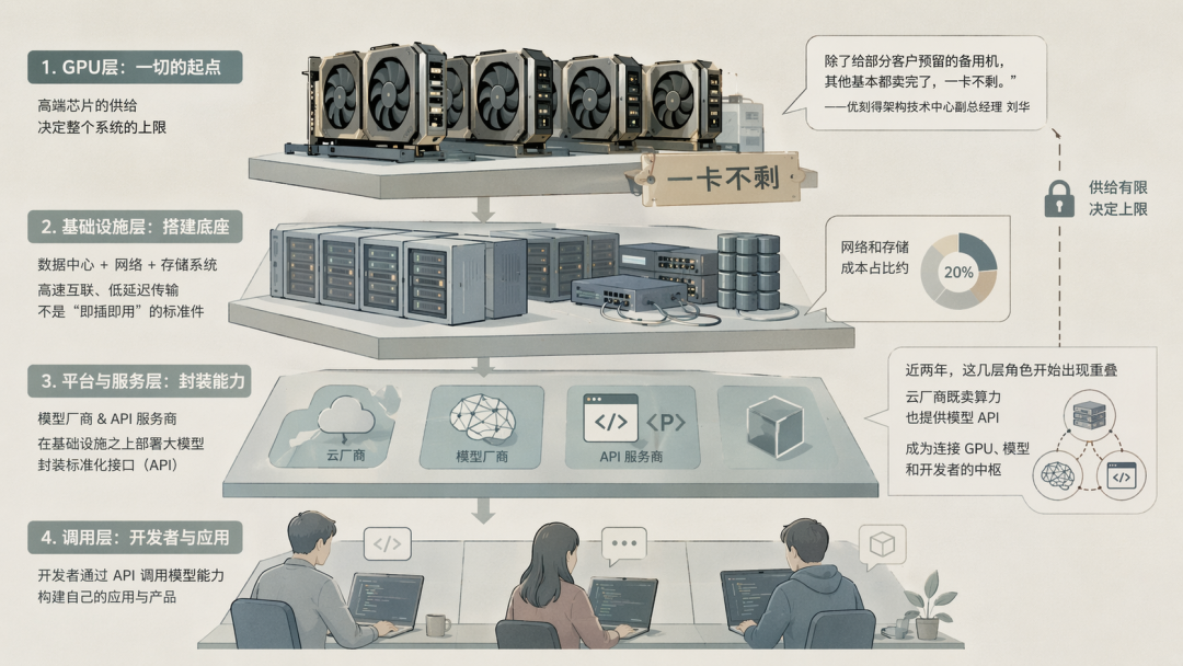 GPU成了一切的起点,高端芯片的供给决定了整个系统的上限。“除了给部分客户预留的备用机,其他基本都卖完了,一卡不剩。”优刻得架构技术中心副总经理刘华说。