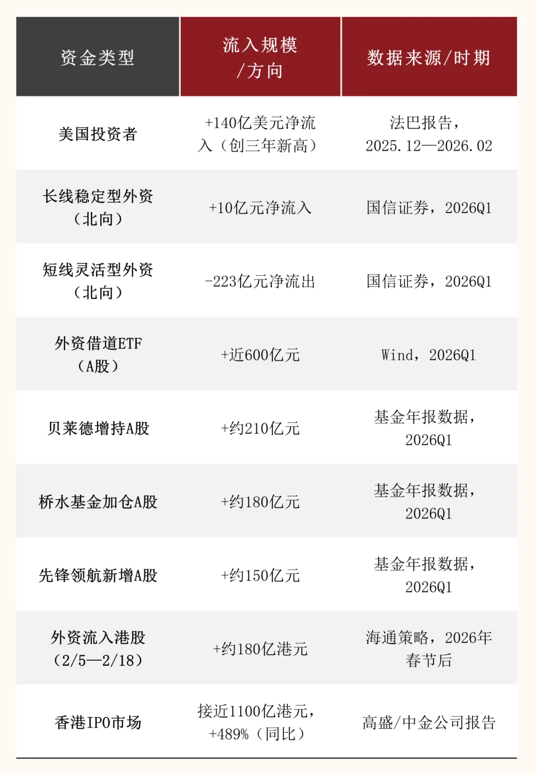 国信证券2026年4月10日发布的《2026Q1股市外资季度动向跟踪》显示,2026年第一季度北向资金整体小幅流出142亿元,但代表养老金、主权基金的长线稳定型外资实际净流入了约10亿元,而短线灵活型外资流出约223亿元。长线资金往往对市场方向有更前瞻的判断,其持续流入预示着配置型资金对A股的长期信心正在修复。