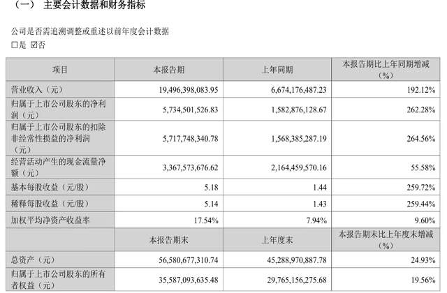 财报显示,2026年一季度公司实现营业收入194.96亿元,同比增长192.12%;归属于上市公司股东的净利润57.35亿元,同比增长262.28%,扣非净利润57.18亿元,同比增长264.6%。