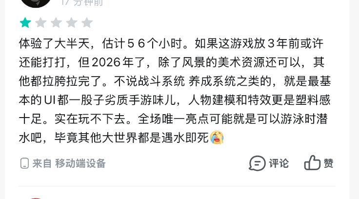 有玩家的评价很扎心:“但凡早两年上线,它还能抢占一点市场;现在开放世界游戏都要下桌了,它才端上来,有种硬炒冷饭的感觉。”