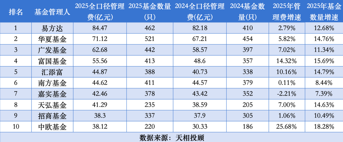 如果只看名次,这种变化并不算剧烈。但名次稳定,并不意味着经营状态稳定。真正值得关注的,是管理费收入与产品扩张之间的背离。把管理费增速和基金数量增速放到一起对照,头部公司的分化会比榜单本身更清楚。