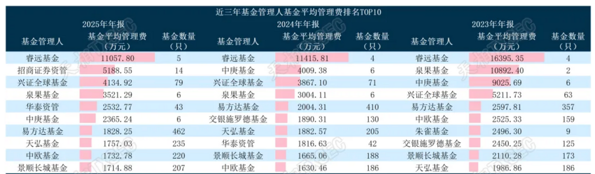 2023年至2025年,睿远单只基金平均管理费从1.64亿元降至1.11亿元,降幅达到32%。泉果和中庚的下滑更加明显。同期,泉果单只平均管理费从1.09亿元降至3521万元,降幅达67%;中庚则从9025万元降至2365万元,累计降幅达到74%。