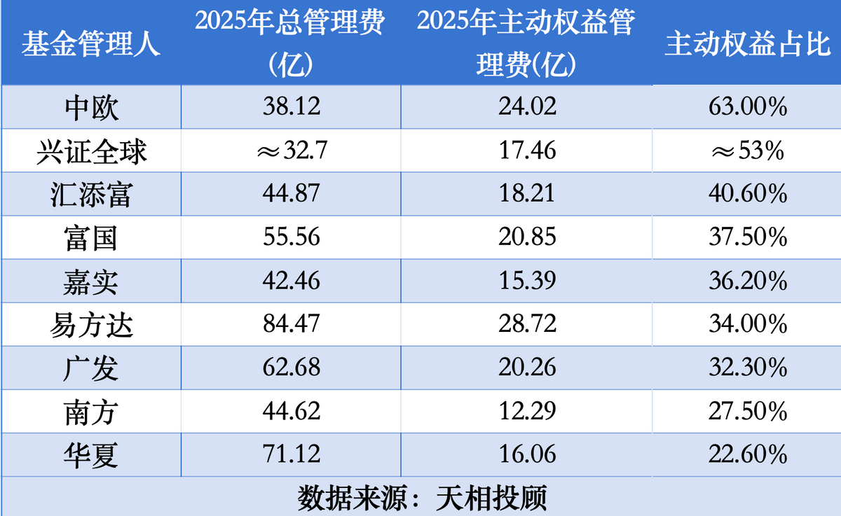 其中,中欧的依赖度最为突出。2025年,中欧总管理费为38.12亿元,其中24.02亿元来自主动权益,占比高达63%。兴证全球约为53%,在头部公司中仅次于中欧。