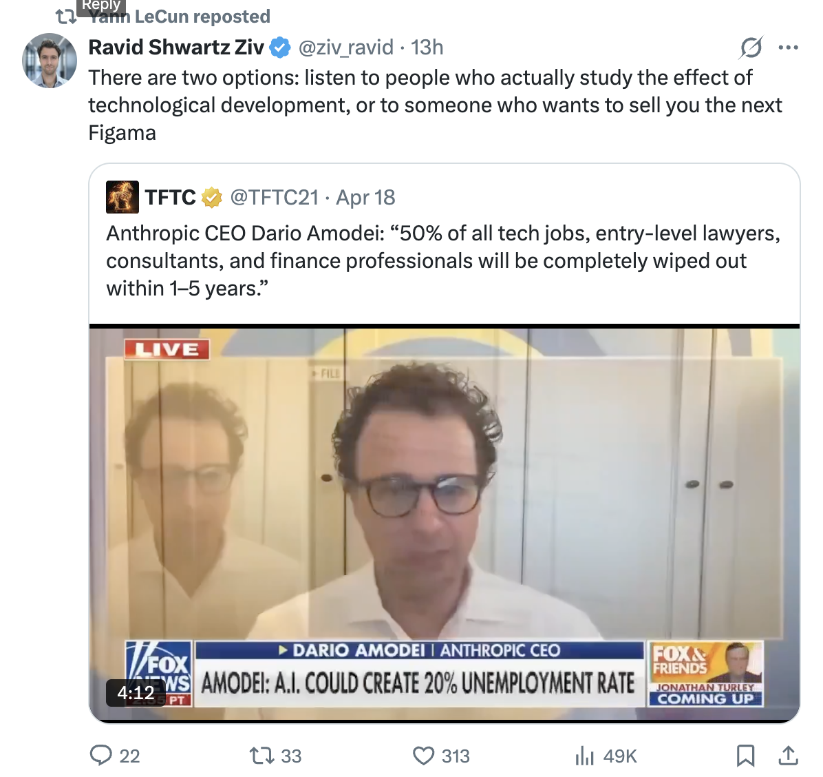 LeCun转发了一条 X,是 Fox & Friends 播出的一段 Dario关于 AI 失业的发言片段说:AI 会在 1-5 年内消灭 50% 的科技岗位、初级律师、咨询顾问和金融从业者。失业率,可能推到 20%。Fox News 把这段剪出来,标题黑底白字:“CEO WARNS A.I. COULD WIPE OUT WHITE-COLLAR JOBS”。