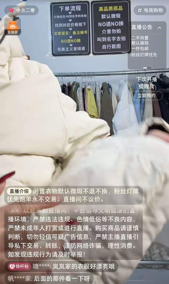 这些货已经在市场上流通一遍了,会有码数不齐、款式不全等情况,但对消费者影响不大。直播间里那些号称孤品样衣的商品,显然不是真正的尾货,更不是新品,而是二手回收衣物。”