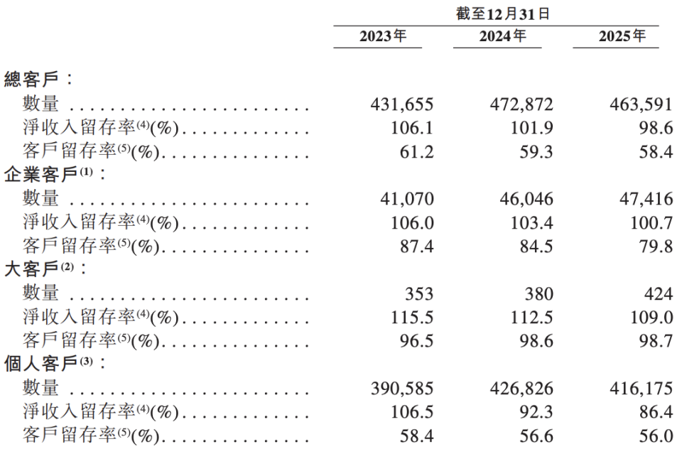 更糟糕的是,客户留存率也在往下掉。企业客户留存率从2023年的87.4%掉到2025年的79.8%,整体净收入留存率从106.1%降到98.6%,整体客户留存率从61.2%滑到58.4%,个人客户留存率更是从58.4%继续跌到56.0%。