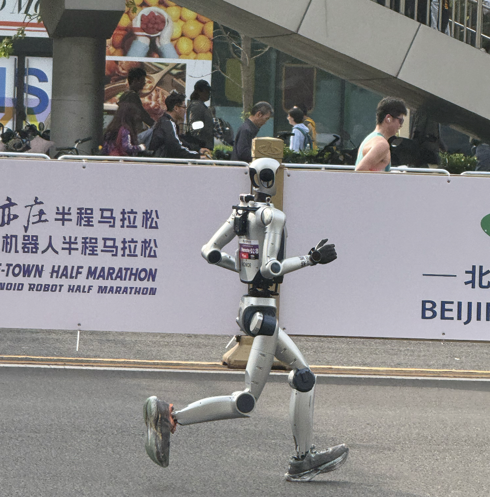 与首届最大的不同在于,今年首次实现“人机共跑”:机器人与人类参赛选手共用21公里的赛道,近四成参赛队伍采用自主导航技术,不再依赖工程师手持遥控器跟随。最终,荣耀旗下的自主机器人包揽前三,冠军队伍“齐天大圣队”以50分26秒的成绩,超过了人类的半马纪录。