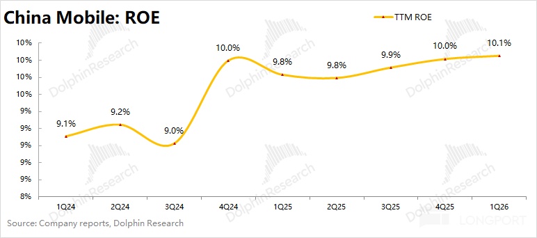 4、ROE 及分红情况:$中国移动(600941.SH) 本季度的 TTM ROE 为 10.1%,同比增长 0.3pct。公司过往分红往往在二三季度,公司本季度分的 197 亿元,实质上是二季度分红的前置。