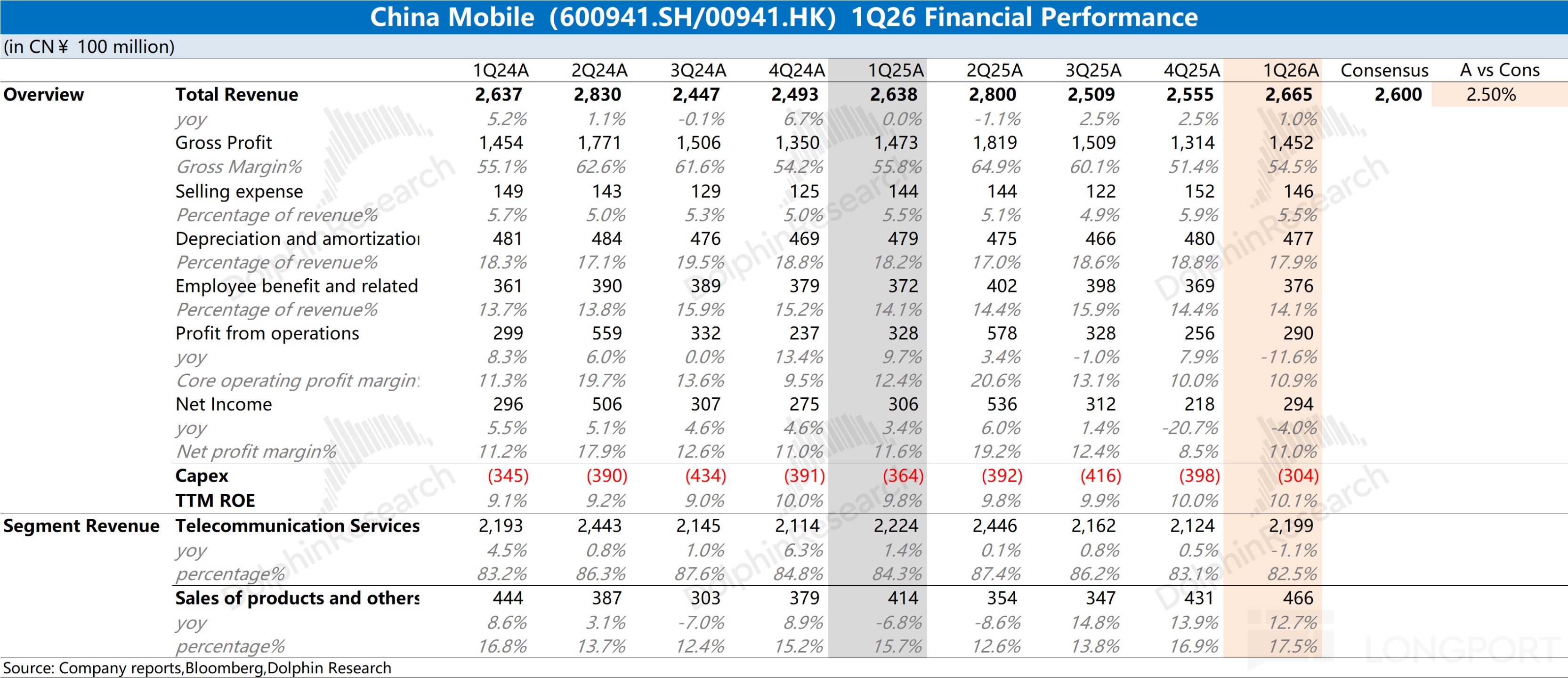 中国移动(600941.SH/00941.HK)于北京时间 2026 年 4 月 20 日晚的港股盘后发布了 2026 年第一季度财报(截止 2026 年 3 月),要点如下: