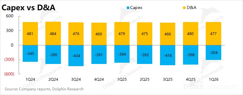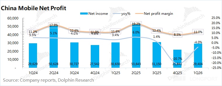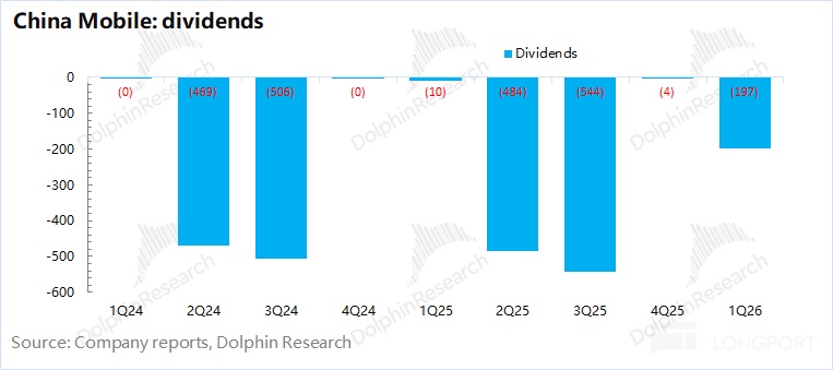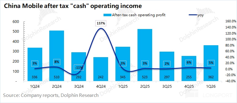 中国移动 2026 年第一季度净利润 294 亿元,同比下滑 4%。由于公司的折旧摊销高于资本开支,从现金流的角度看,公司本季度的税后现金性经营利润为 362 亿元(不考虑非经营因素影响),同比也有 17 亿元的提升。