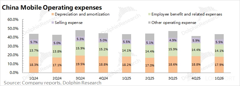 中国移动 2026 年第一季度经营费用 1162 亿元,同比增长 1.5%。海豚君将 “销售费用”、“雇员薪酬费用”、“折旧及摊销” 和 “其他营运支出” 四项都放在经营费用中;