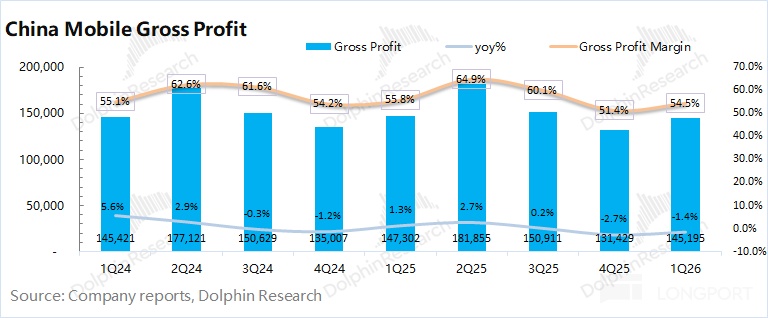 中国移动 2026 年第一季度毛利率 54.5%,同比下降 1.3pct。海豚君将 “网络运营及支撑成本” 和 “销售产品成本” 列为营业成本,进而测算公司毛利及毛利率情况。