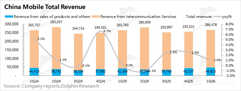 中国移动 2026 年第一季度总营收 2664.8 亿元,同比增长 1%。分项来看,其中公司本季度来自于通讯服务的收入为 2198 亿元,同比小幅下降 1.1%;来自产品销售及其他的收入为 466 亿元,同比增长 12%,是公司本季度增长的主要推动力。