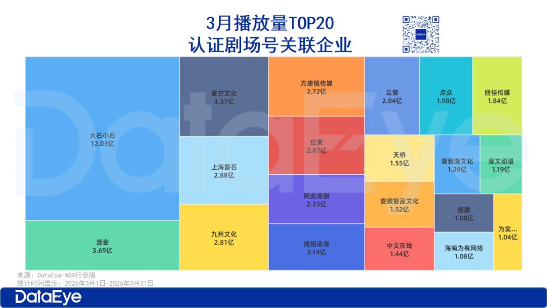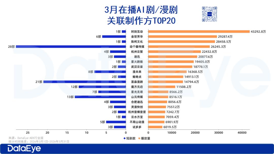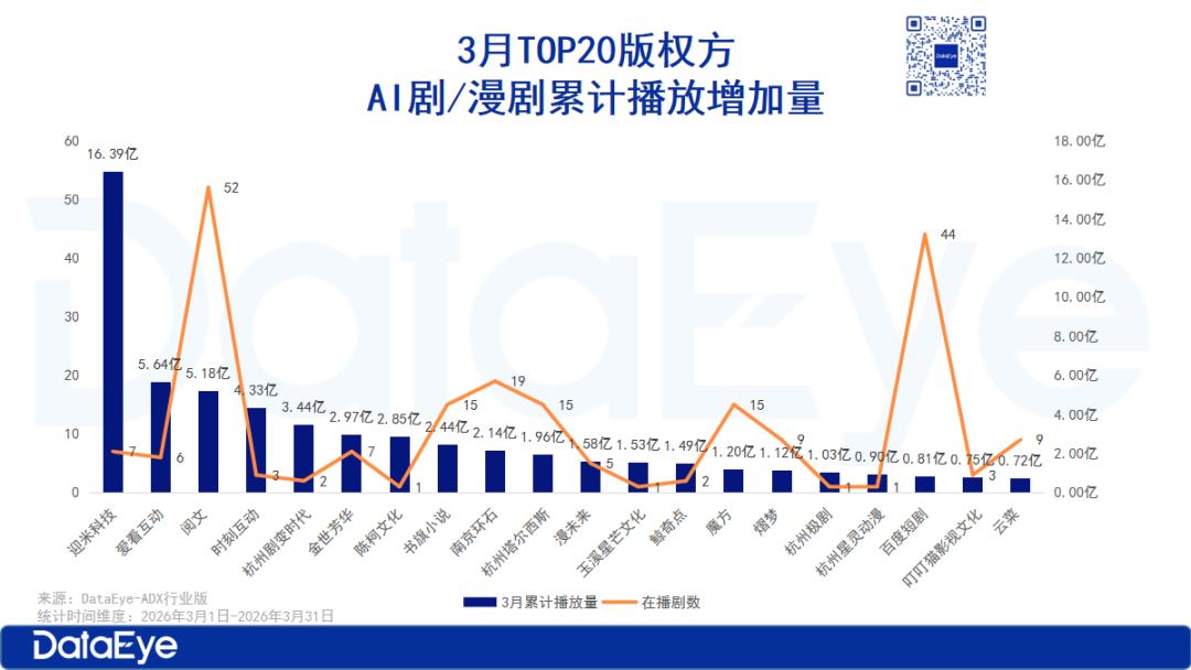 从新上线漫剧关联的版权方来看,迎米科技、爱看互动、陈柯文化占据TOP3关联播放量均超2亿,合计占TOP20版权方总计播放量的44.75%,是3月新剧流量大盘的绝对核心供给方,行业爆款新剧的主要产出源头。