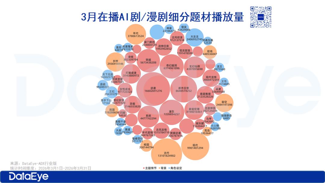 在主题情节方面,3月份“逆袭”“重生”“都市日常”“奇幻脑洞”等题材以超5亿播放量领先,反映出用户对爽感叙事、成长逆袭类内容的高度偏好。