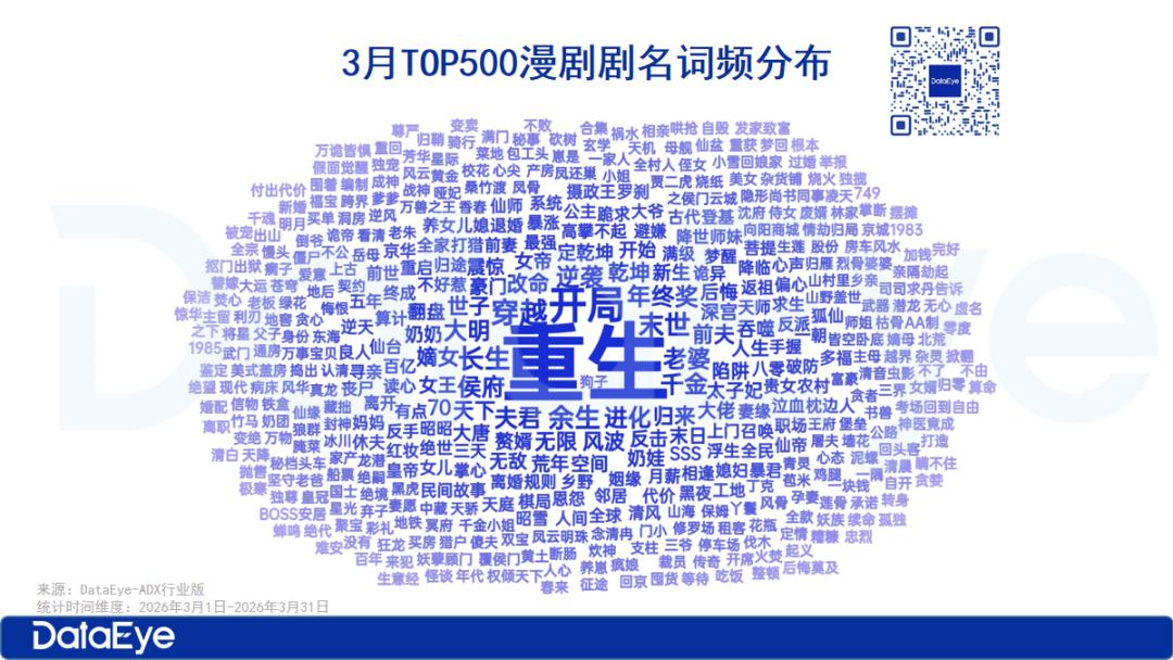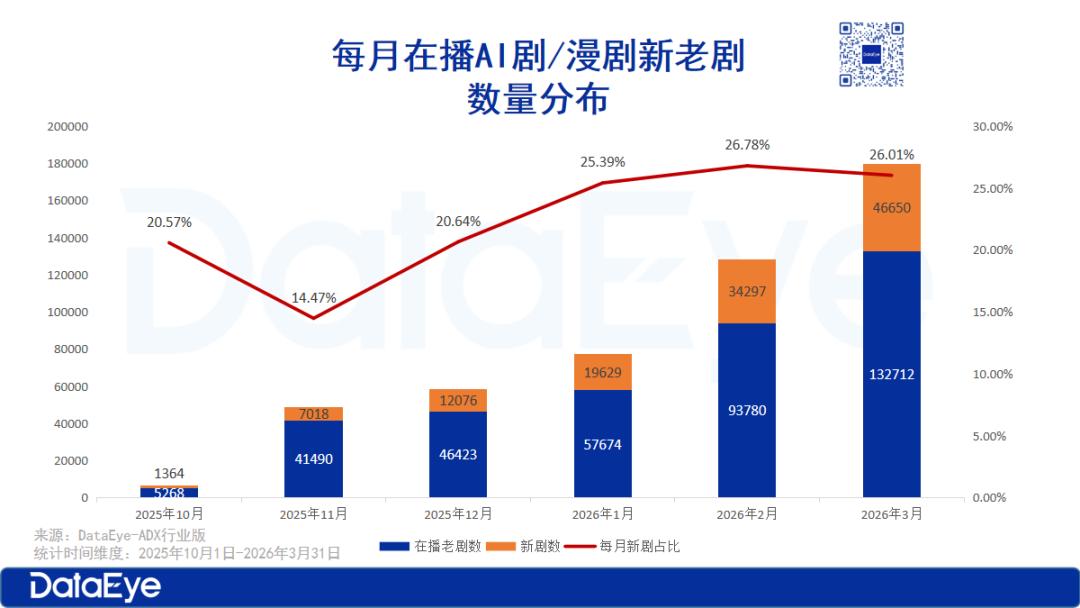 根据DataEye-ADX行业版数据显示,2026年3月,新上线漫剧数约4.7万部,较2月上线漫剧数的3.43万部,新剧数占比维持在26%,说明行业整体上新节奏稳健。