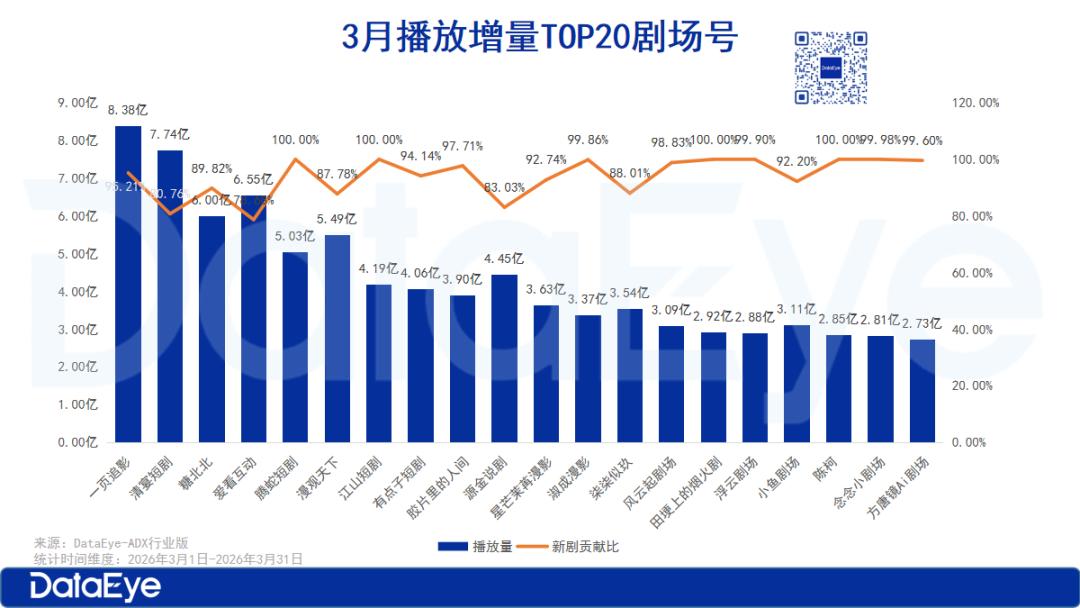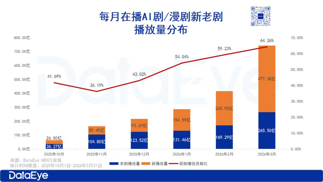 根据DataEye-ADX行业版数据显示,2026年3月在播的AI剧及漫剧总数达17.94万部(含2024年上线并持续在播剧目),市场供给充足。3月总体的播放增量近750亿,其中新上线AI剧及漫剧的播放增量达477.38亿,占3月总体播放增量的64.26%。