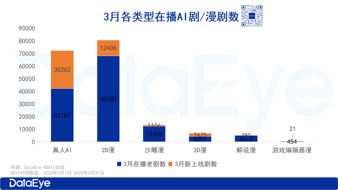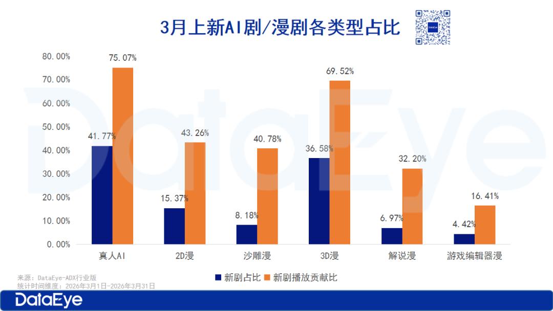 赛道上3月的产出以AI仿真人剧为主,但存量剧中,2D漫和3D漫亦有涉及,题材储备与用户主流偏好高度契合。