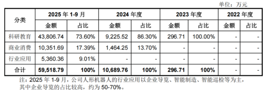 宇树科技招股书披露,宇树人形机器人的应用领域均划分成了三类,分别是科研教育、商业消费、行业应用。2025年1-9月,科研教育相关应用占比超七成,而真正的行业应用只占9%左右。