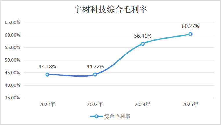 宇树科技的招股书显示,2025年度公司实现营业收入17.08亿元,同比增长335.36%;同期实现扣非后净利润6亿元,同比增长674.29%,主要原因为当期产品销量的快速增长。2023-2025年,公司综合毛利率分别为44.22%、56.41%和60.27%,逐年走高。