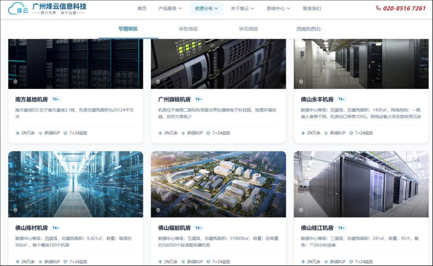 以上仅为烽云信息区域集中布局缩影。官网显示,烽云信息在华南地区以广东省内5大机房节点组成核心算力集群,含核心节点与综合业务节点,仅在广东佛山布局五大机房。