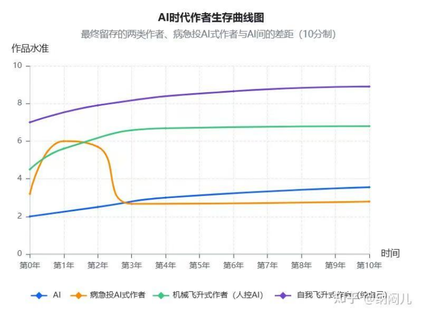 近期在知乎上有一张《AI时代作者生存曲线图》(作者纳闷儿)显示,前AI时代的头部作者竞争主要围绕更新速度和套路熟练度展开。后AI时代,头部作者群体正呈现出两种截然不同的创作路径。