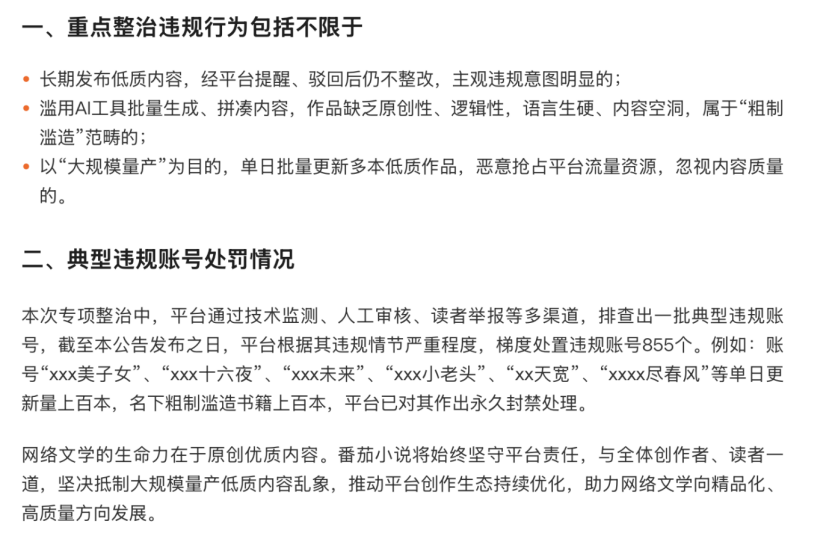2026年2月,该平台发布公告,点名部分账号滥用AI技术进行大规模批量创作。有违规账号单日更新上百本作品,平台最终梯度处置了855个账号。