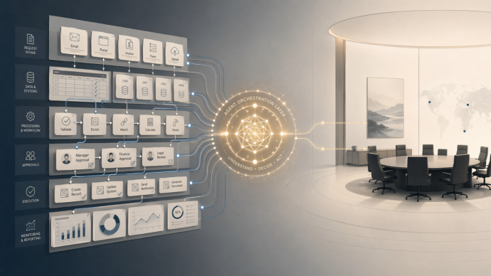 请为一篇商业分析文章生成头图,文章标题是“为什么agent会先改变中后台,而不是先取代CEO”。请先理解这个标题的含义,再构思一张具有隐喻意味的插图:画面左侧是多层流程、表格、审批节点和任务队列,右侧是一个被简化成抽象符号的高层决策室,中间由一个发光的代理系统连接。要求插图传达“AI最先改造的是重复流程密集的组织中层和运营层,而不是直接替代最顶层判断”,整体风格为高级商业媒体插画,克制、不幼稚、不赛博朋克。