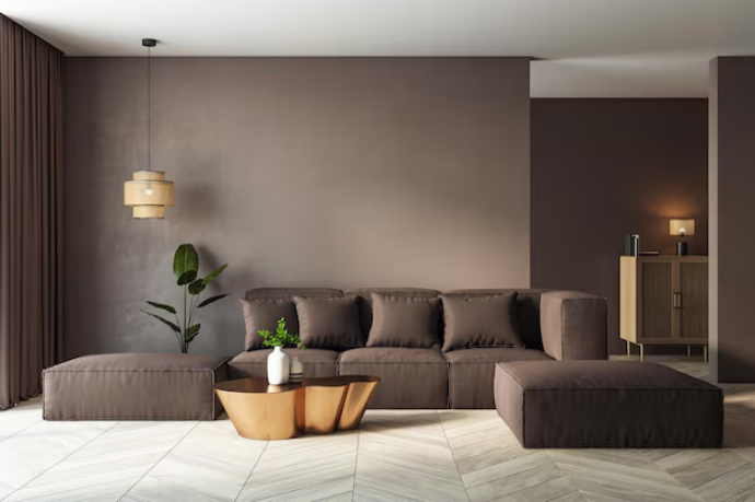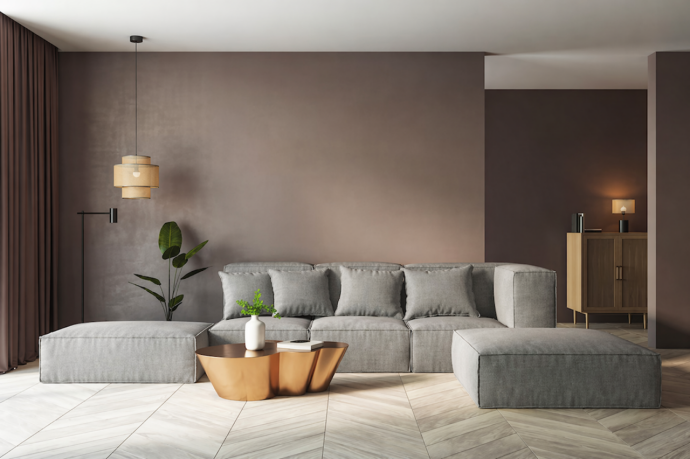 把原本的深棕色三人沙发替换成浅灰色模块化布艺沙发2. 在沙发左侧增加一盏黑色细杆落地灯3. 茶几上加上一本封面简洁的白色画册