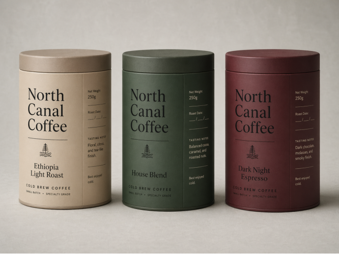 设计一套精品冷萃咖啡的包装系统,品牌名为North Canal Coffee。请同时展示三罐产品:Ethiopia Light Roast、House Blend、Dark Night Espresso。三款保持统一品牌结构,但颜色分别为浅沙色、深绿、酒红。每个罐体都需要看到正面品牌名、口味名,以及侧面的净含量“250g”、烘焙日期占位、风味描述小字。整体风格高级、北欧、克制,像真实消费品牌的上架包装。要求品牌名拼写一致,小字尽量可读,三款产品家族感强,不要把包装做成华而不实的概念艺术品。