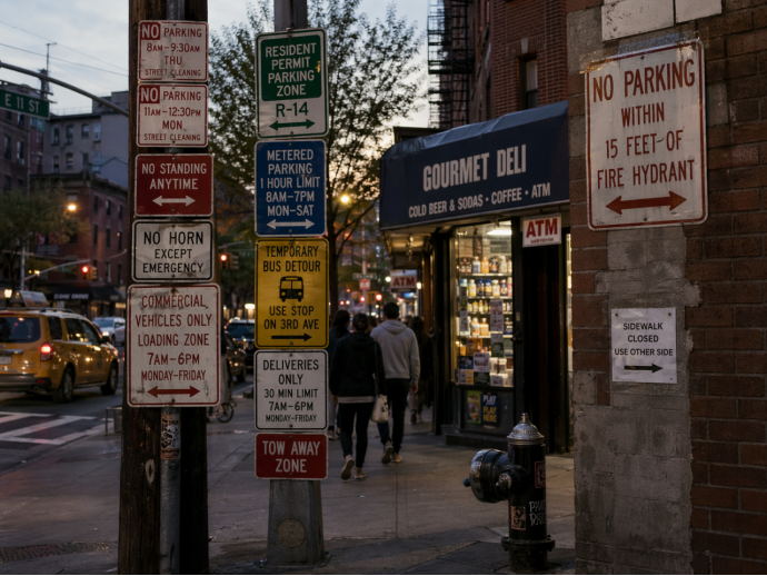 生成一张纽约街头的写实照片,傍晚自然光。路边电线杆和墙面上有大量真实城市标识,包括停车规则、清扫时间、禁止鸣笛、装卸区说明、居民停车许可证提示、公交临时改道告示。要求至少出现10块不同尺寸的牌子,英文内容清晰、风格像真实市政系统,透视统一,材质真实。街景里可以有出租车、消防栓、行人和便利店,但重点是这些标牌要像真的存在于同一条街上,而不是一堆漂浮的文字贴片。