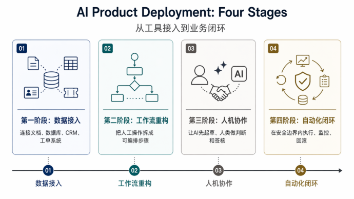 底部有一条时间轴,上方有标题“AI Product Deployment: Four Stages”,下方有中文副标题“从工具接入到业务闭环”。请为每列使用不同但克制的商务配色,每张卡片内要有简洁图标、标题和两行说明文字。整体风格像麦肯锡或红杉资本会使用的报告图表,清晰、可读、可用于演讲材料。