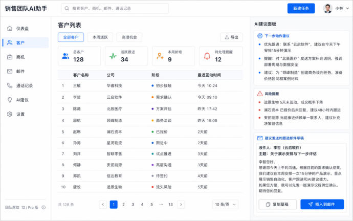 右侧侧栏:AI建议面板,显示“下一步动作建议”“风险提醒”“建议发送的跟进邮件草稿”